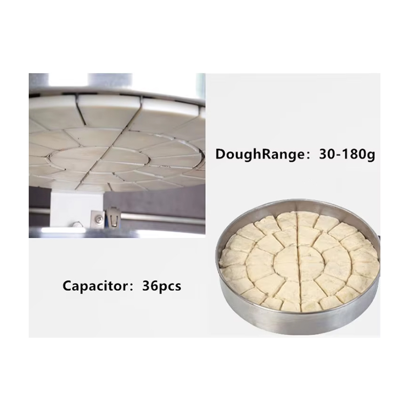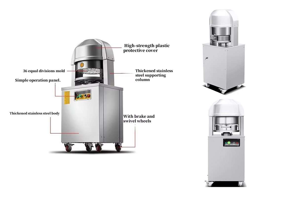 - Esta cortadora divisora de masa eléctrica está diseñada para panaderías comerciales, ofreciendo alta eficiencia y porciones precisas con 36 piezas por corte.