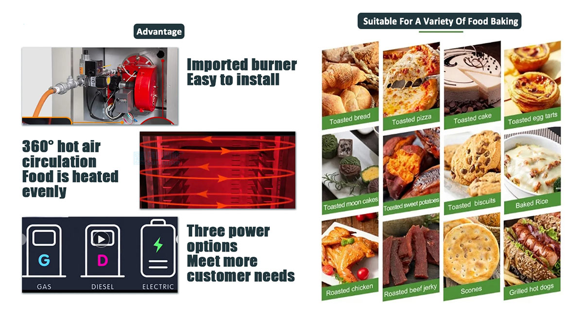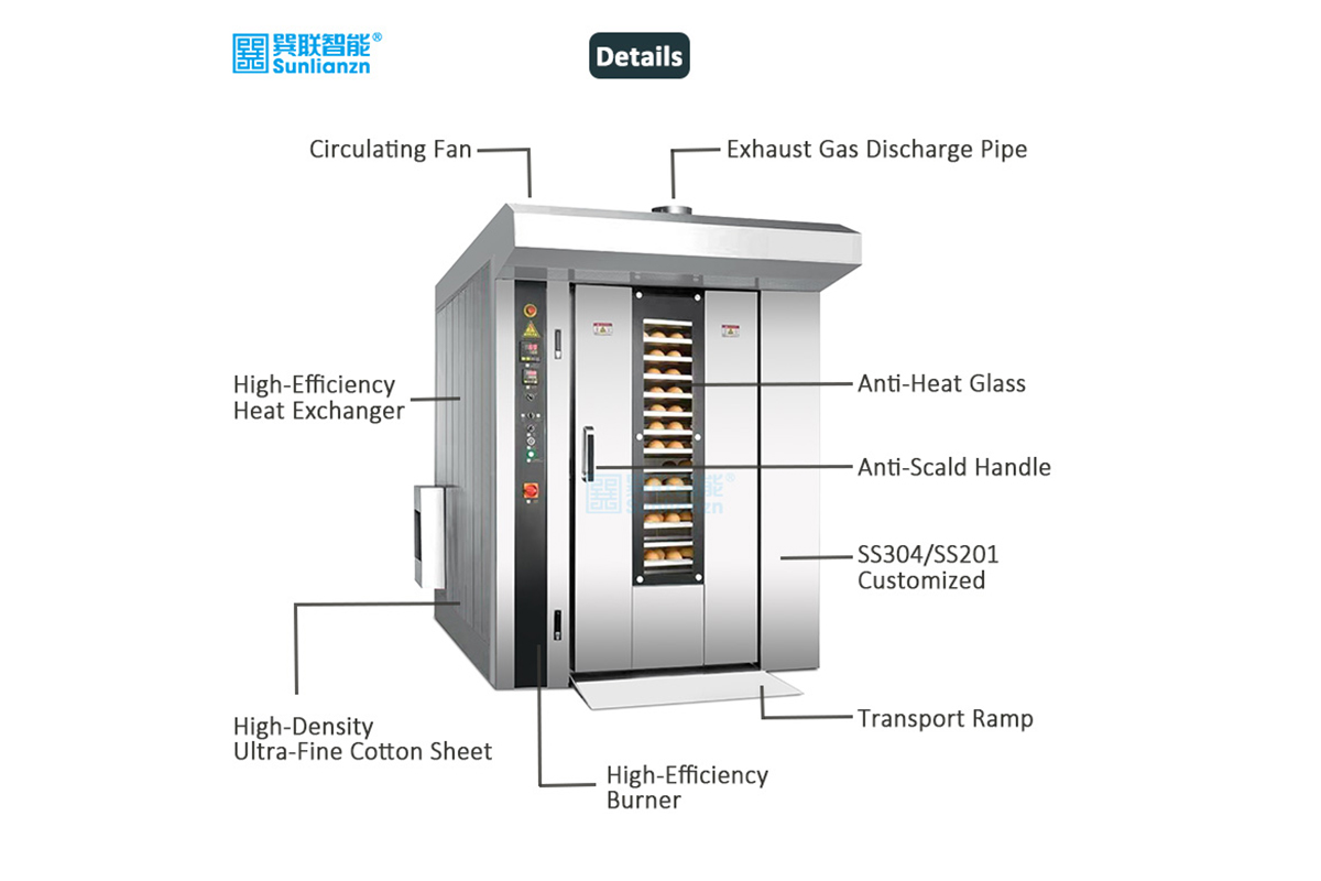 Horneado comercial de 32 a 64 bandejas, ahorro de energía y durabilidad. Calentamiento giratorio de 360° y velocidad del aire ajustable, evitando diferencias de temperatura locales, con una mejora del 15% - 20% en la eficiencia de horneado a granel.